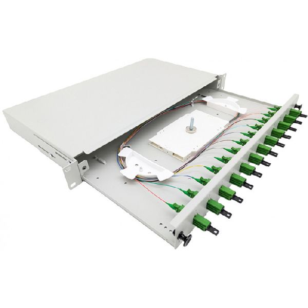 Produktinformationen "Tecline 205OS2LSHA12 Tecline LWL Spleißbox, 12-fach LSH APC Simplex, OS2, mit LSH APC Simplex-Kupplungen und Pigtails, 19", ausziehbar, lichtgrau RAL"
